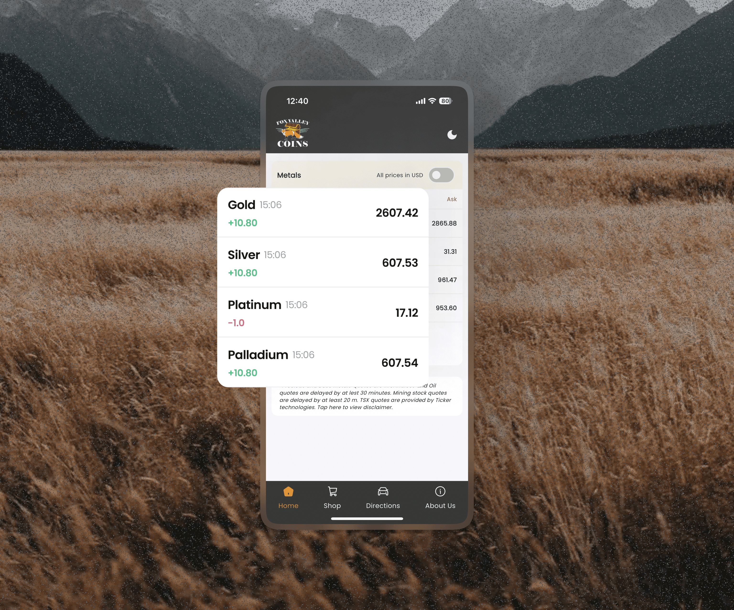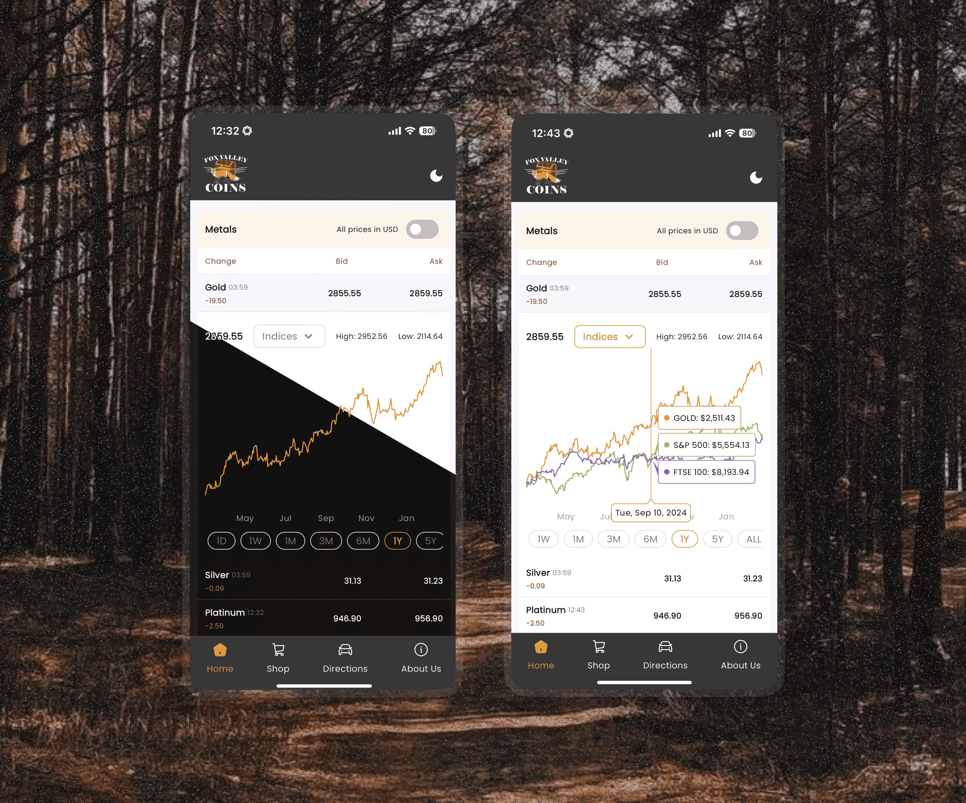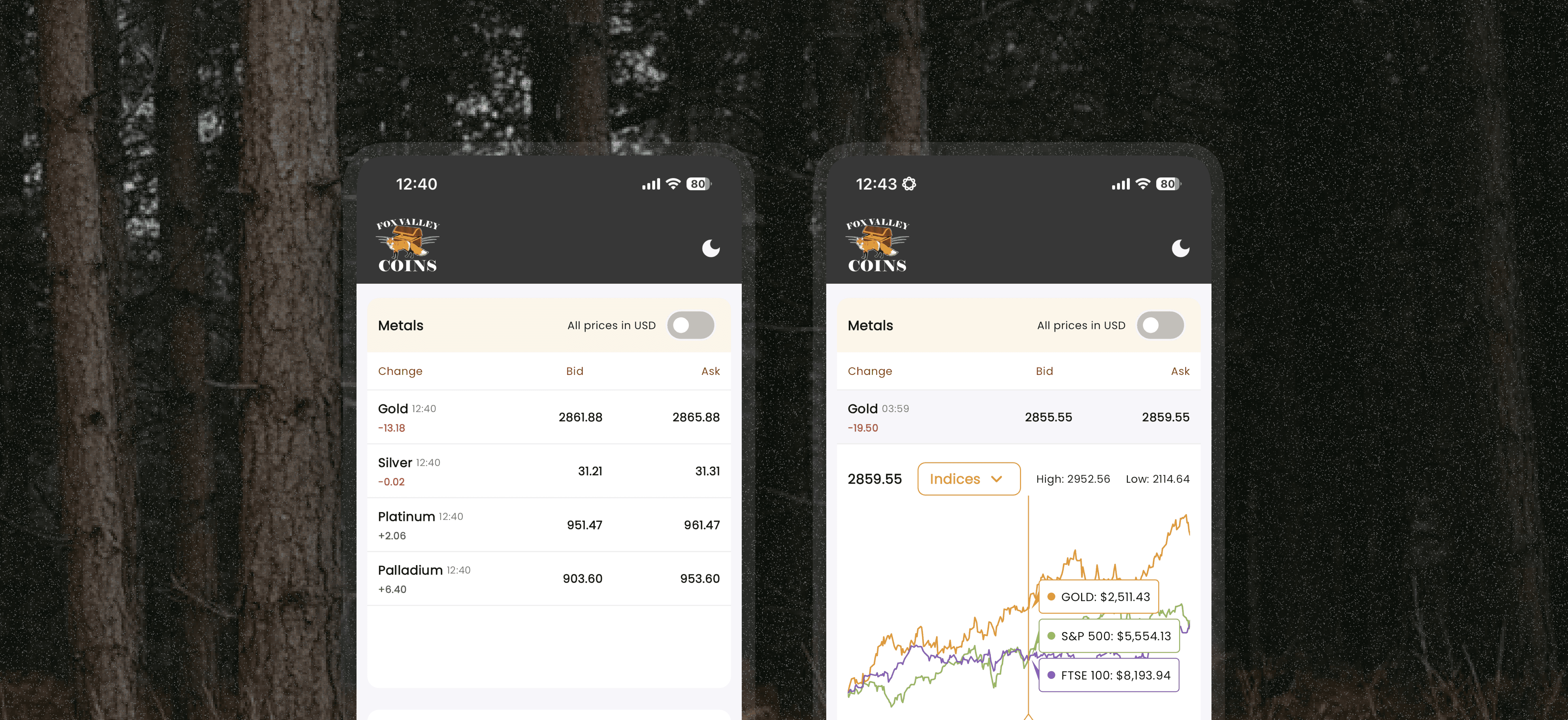 Our app addresses these challenges head-on with live market prices, a dark & light mode for a comfortable viewing experience, and an intuitive interface suited to both casual collectors and professional traders. By delivering up-to-the-minute pricing and streamlined tools, Fox Valley Coins ensures you stay ahead of market trends and make confident investment decisions.